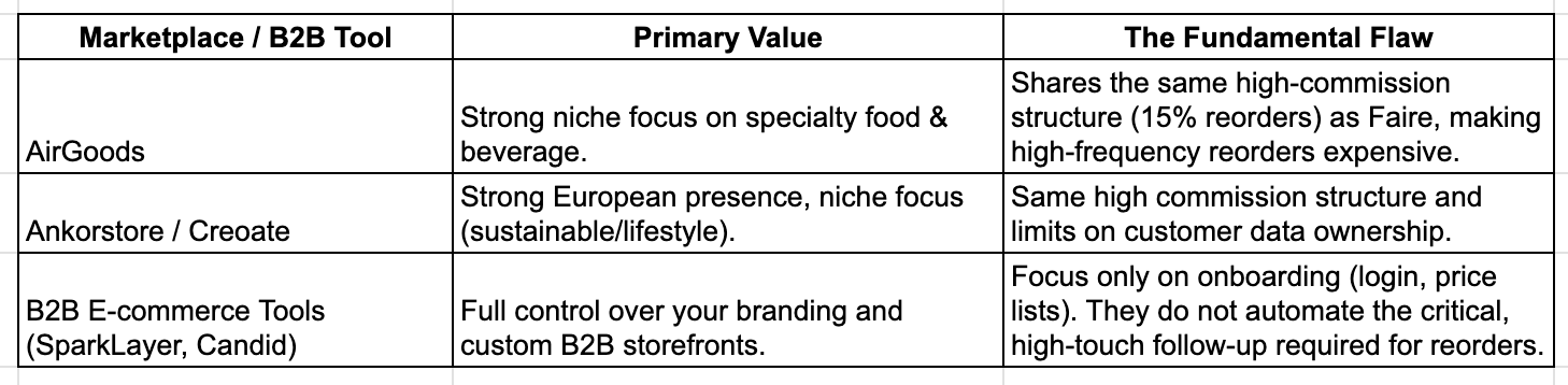 Use Marketplaces (Faire, AirGoods) for Discovery: Leverage their marketing dollars and retailer incentives to acquire the initial customer. Always push new prospects to order through your Faire Direct link to secure your first 0% commission order.